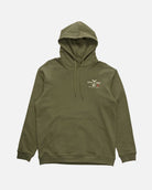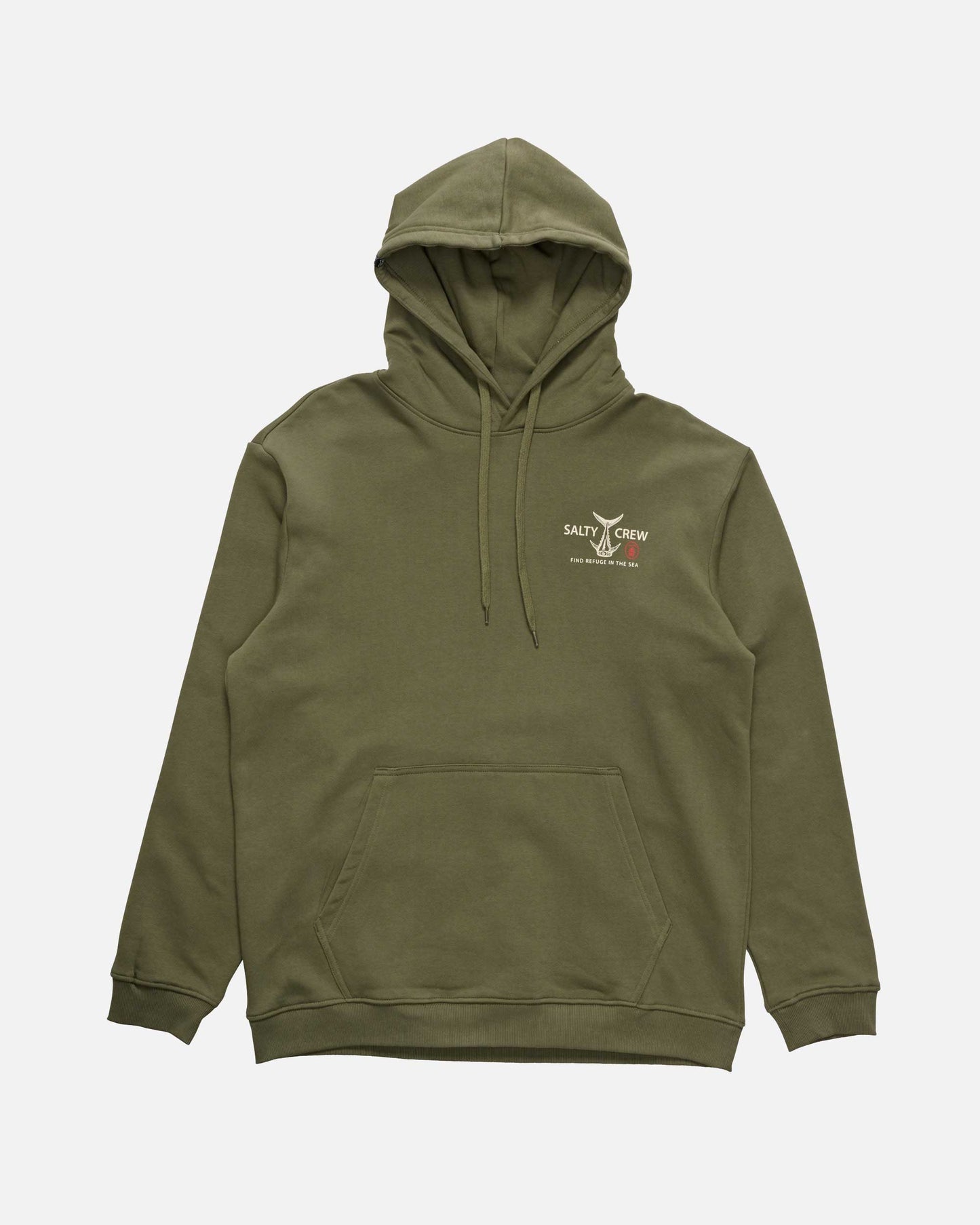 Ichiban Hood in Dusty Olive is made from our signature mid-weight Cotton/Polyester Brushed Fleece, 380gsm in weight. Featuring two-piece hood with encased drawcord, rib knit cuffs & hem, self-fabric kanga pocket & Salty Crew clamp label at hood opening. Screen Printed front and back prints.
