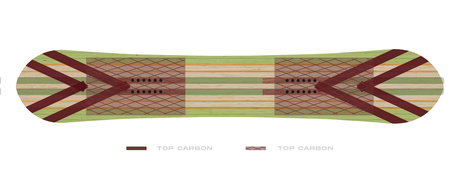 Carbon Fiber strands are positioned from the binding mounting area toward the ends of the board, additionally broad elastomeric rubber damping strips are layed on top of the carbon fiber. This stabilizes the board at high speeds and through choppy snow conditions, while absorbing residual vibration or flutter in the nose and tail.