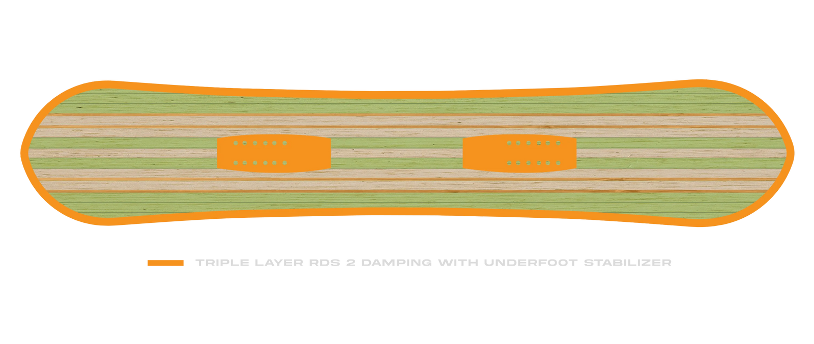 RDS 2 or Rubber Damping System 2 is the perfect balance of freeride stability and freestyle liveliness. A more substantial system than a freestyle board to stabilze the board at higher speeds but a little less than damping in a freeride board for leaving the snow. An ideal combination of vibration absorbtion and energetic feel.