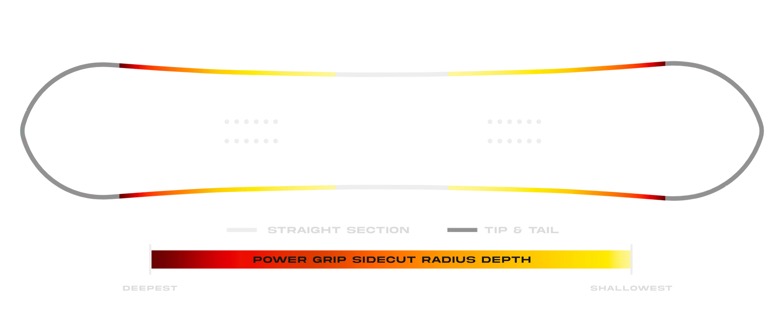 POWER GRIP SIDECUT utilizes multiple radiuses creating extra contact points to enhance edge hold. A flat section in the rocker area provides a broad contact point when flexed, however when unbent allows the board to track straight and not catch. Flanking this straight section are two shallow radiuses which provide the second and third contact points. Towards the ends of the sidecut are deep radiuses which render quick turn initiation and the final contact points.