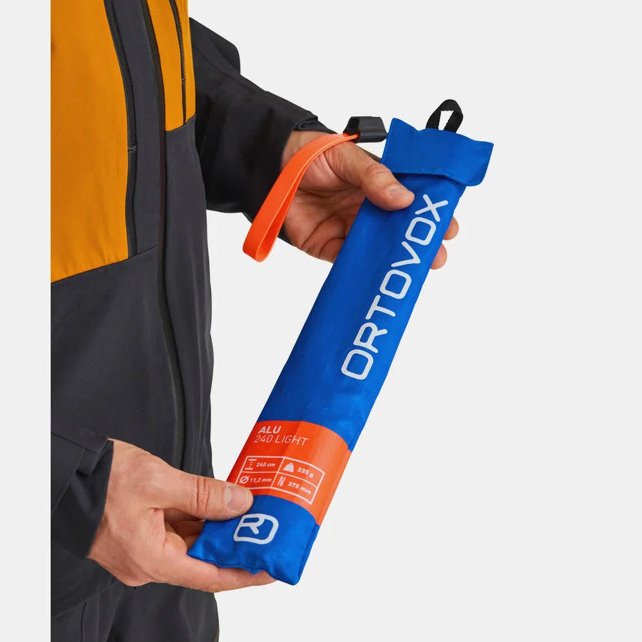 Lightweight, fast and safe: The ALU 240 LIGHT is the probe for all weight-conscious winter sports enthusiasts. Weighing in at just 235 grams, it is incredibly light and ready to use in just seconds thanks to the quick-assembly strap and quick-lock assembly system. The tension can be quickly and easily set by means of the optimized adjusting screw. The large probe tip, which has a significantly larger diameter compared to the probe elements, ensures improved penetration. We have also optimized the probe segments so that they now have a more compact pack size. The ALU 240 Light therefore fits easily into your tour backpack.
