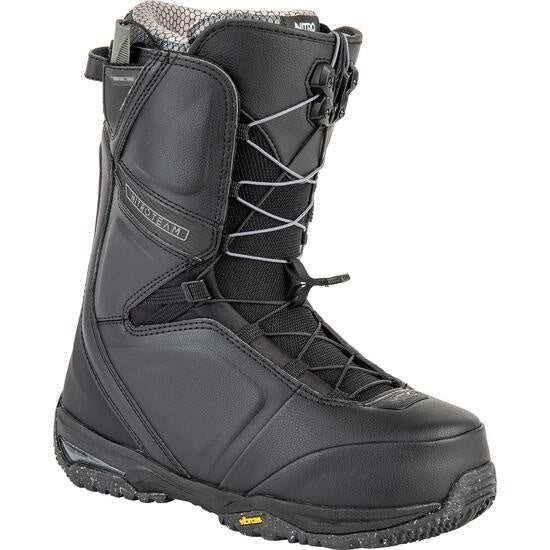 The Nitro Team boot is the go-to boot for snowboarders everywhere, from pros to local legends, because of its undeniable comfortable fit, versatile flex, and time-proven performance. Equipped with a Vibram® Outsole made of Vibram® ECOSTEP™ Compound, EVA Midsole, and an Air Dampening system underfoot for superior cushioning for all-day resort boarding and the best grip for those long hikes to the summit after the lifts close. Available in standard lacing or our team-trusted TLS Twin Lacing system for a customizable fit with an upgrade in speed thanks to the 45° Laceglider for a smooth lace-up and added lace durability. Combining the Cloud 9 Liner and Ortholite® Dual Density Footbed provides all-day cushioning and a sure foothold. Simultaneously, the Re/Lace Liner Locker allows you to retighten your liner mid-run or on the chair with ease if you feel the need for a mid-day adjustment. Like 22-year veteran Nitro team rider Eero Ettala, experienced pros ride the Team boot because it provides stability, comfort, reliability, and response needed to help push the bar even further. It's easier to push your limits when your feet are comfortably warm, and that's just what the reflective Therminator Shield does - keeps the heat in the boot where it belongs, especially on those bitter mid-winter days. Team-tested, time-proven performance with a fit just perfect for you!