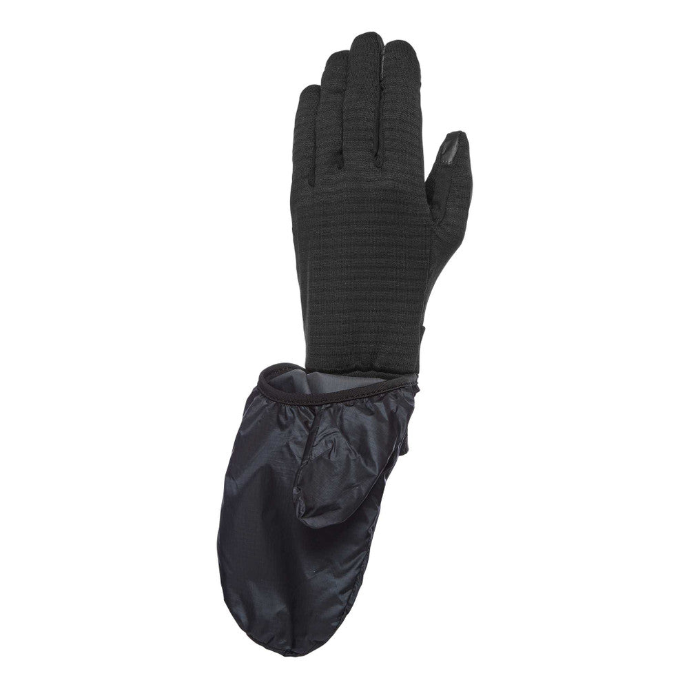 For ski touring, ultra running and other aerobic alpine pursuits through variable terrain and changing conditions, the Black Diamond Wind Hood GridTech Gloves combine a warm yet lightweight grid fleece that traps warmth in gridded channels without inhibiting breathability, with a stowable, weather-resistant flap hood that quickly deploys when the weather turns south. The mitt-style Pertex® Quantum Pro mitt helps combat chilly alpine temps easily rolls up and hides away in mild weather. PrimaLoft® Gold insulation protects against cool temperatures, while the grippy palm provides a good grip on poles and other equipment.