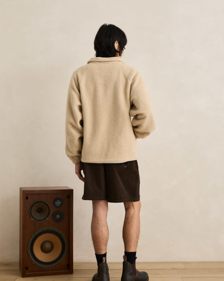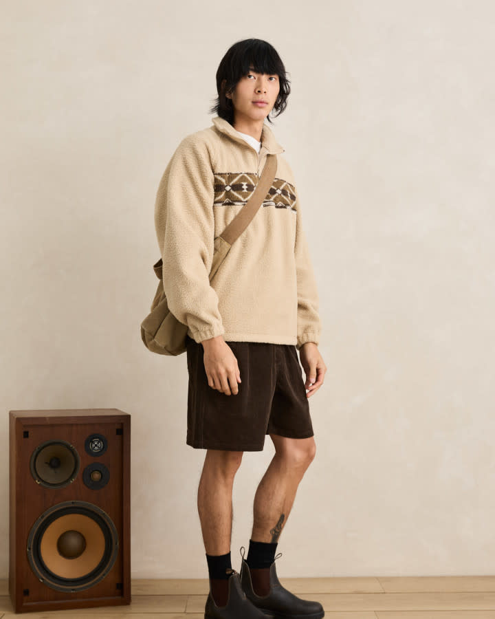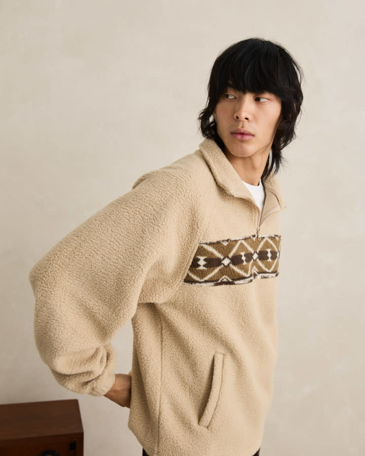 Made from a natural-toned fleece, this quarter zip features a contrast polar fleece panel across the chest with in-house designed artwork and a vintage fit feel.