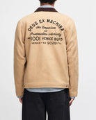Regular fit workwear jacket with wool mix body lining, embroidered address on back, welt pockets, zip closure, metal branded snap hem and cuff adjusters.