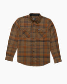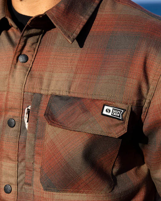 The Fathom Long Sleeve Tech Flannel Shirt in Dark Brown is a button-up shirt made from mid weight polyester/elastane in a yarn-dyed check design. It features a durable water repellent (DWR) coating, a two-piece collar, and Salty Crew branded snap buttons at the centre front.