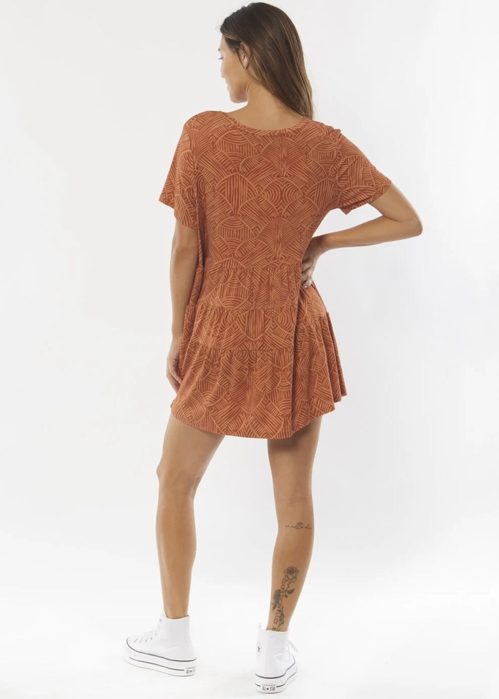 Don't Speak is a printed tee dress with tiers and short sleeves.
