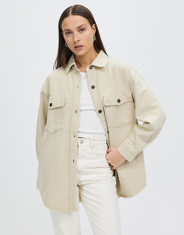 The Claude Drill Shacket is ideal for layering on chilly mornings as you chase the sunrise. Its oversized, warm cotton make it a cosy and stylish choice for all seasons. Now available in a light, loose fit for the celebration of our 20 year heritage, drawing the silhouettes natural colour from our valued styles of seasons past.
