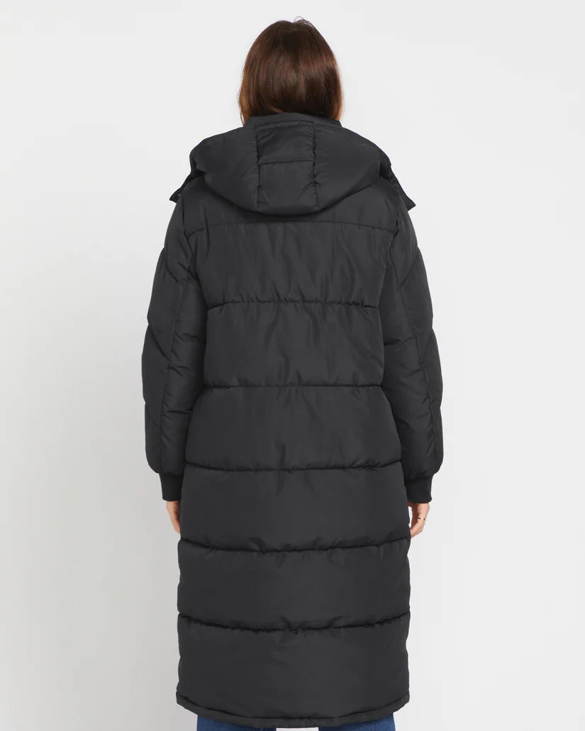 Stay cozy All Day Long in this heavy-duty puff jacket. Made with non-pfc, durable water-repellent finish, it's filled with soft, insulating polyfill for maximum warmth. The boxy, long-length fit, hand-warming pockets, and removable hood make it the perfect winter essential, while the Volcom branding adds a stylish touch. Featured here in black.