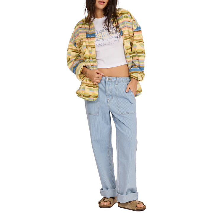 The Sisstrevolution Women's Washed Ashore Long Sleeve Button-Up Fleece Shirt is a dropped shoulder long sleeve polar fleece with two patch pockets and a slight shirt tail.