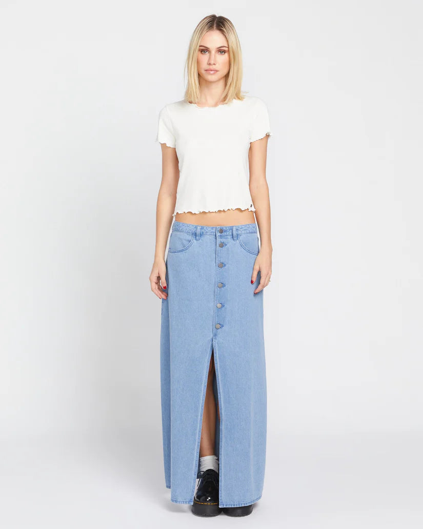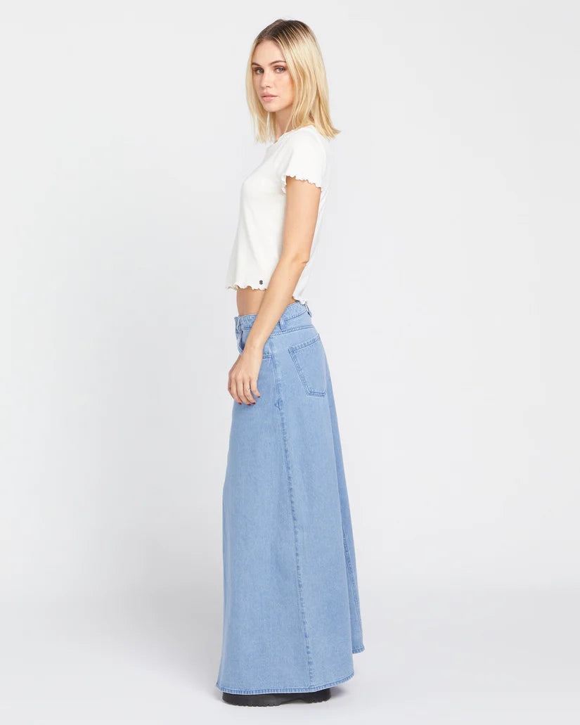 Low rise denim column maxi skirt - front shank button hardware closure over center front slit