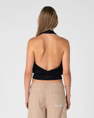 Halter Neck Fashion Top With Back Embroidery Logo. 90.8% Rayon / 9.2% Spandex