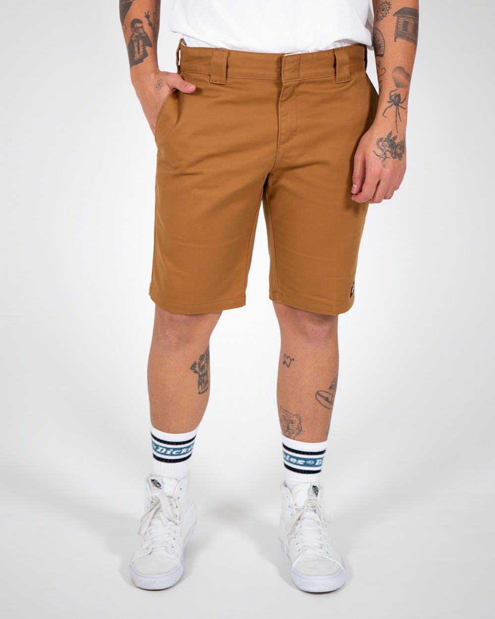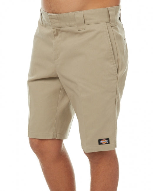 Slim fit work short in durable poly cotton twill. Inside leg length 10 inches. Hook & Bar closure.4 pockets. Woven logo at the reverse. Stain release & wrinkle resistant. Fitted waistband with tunnel belt loops.