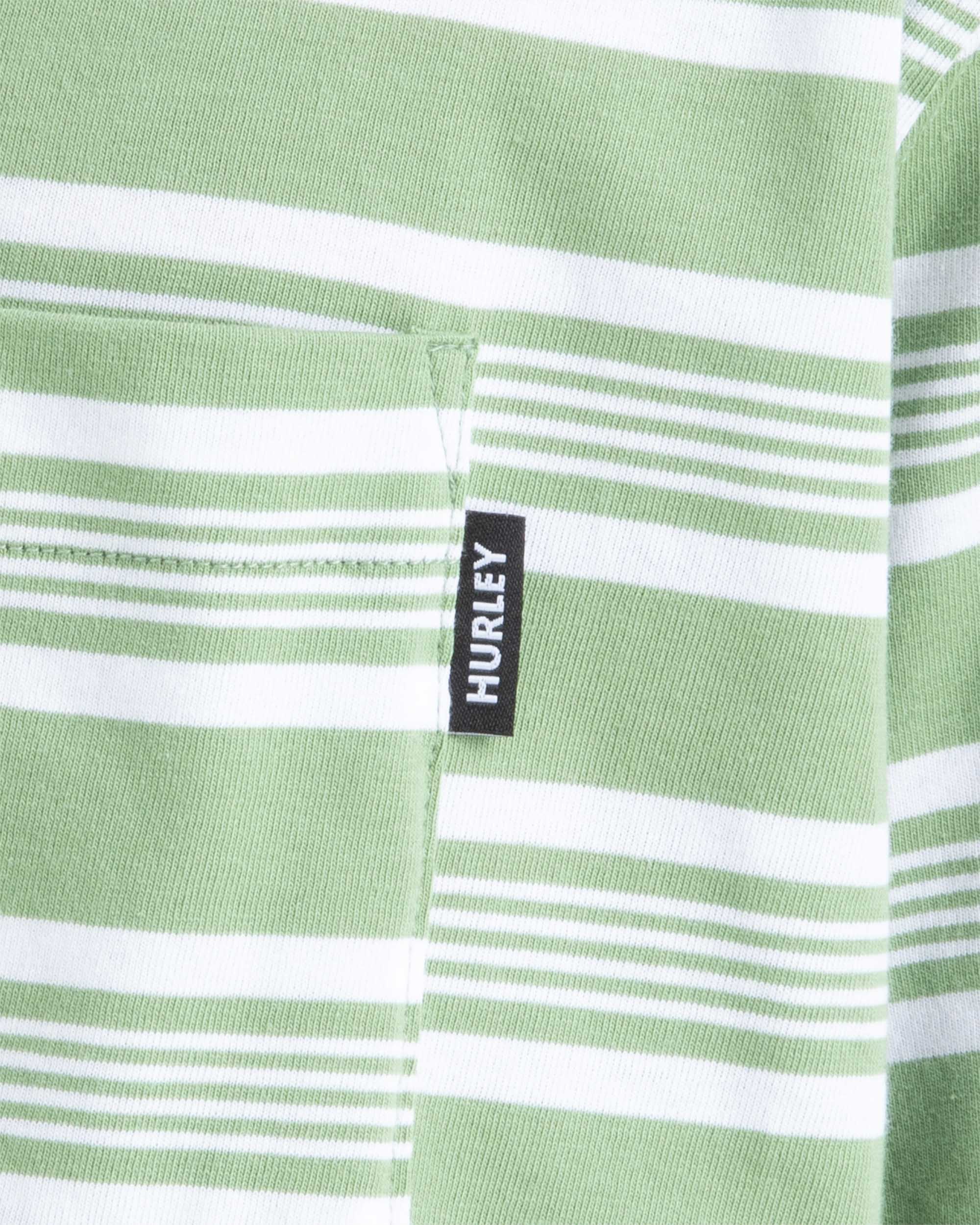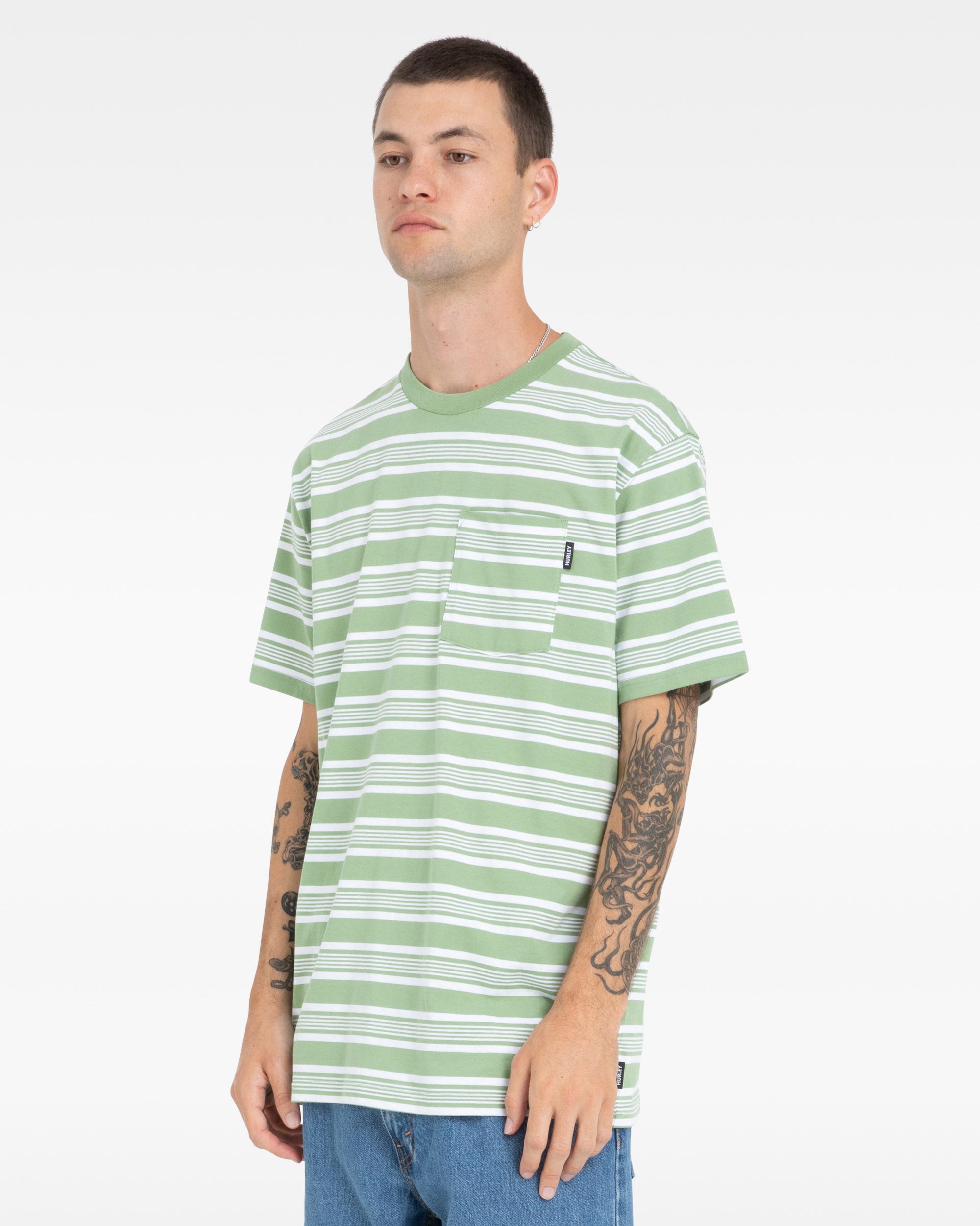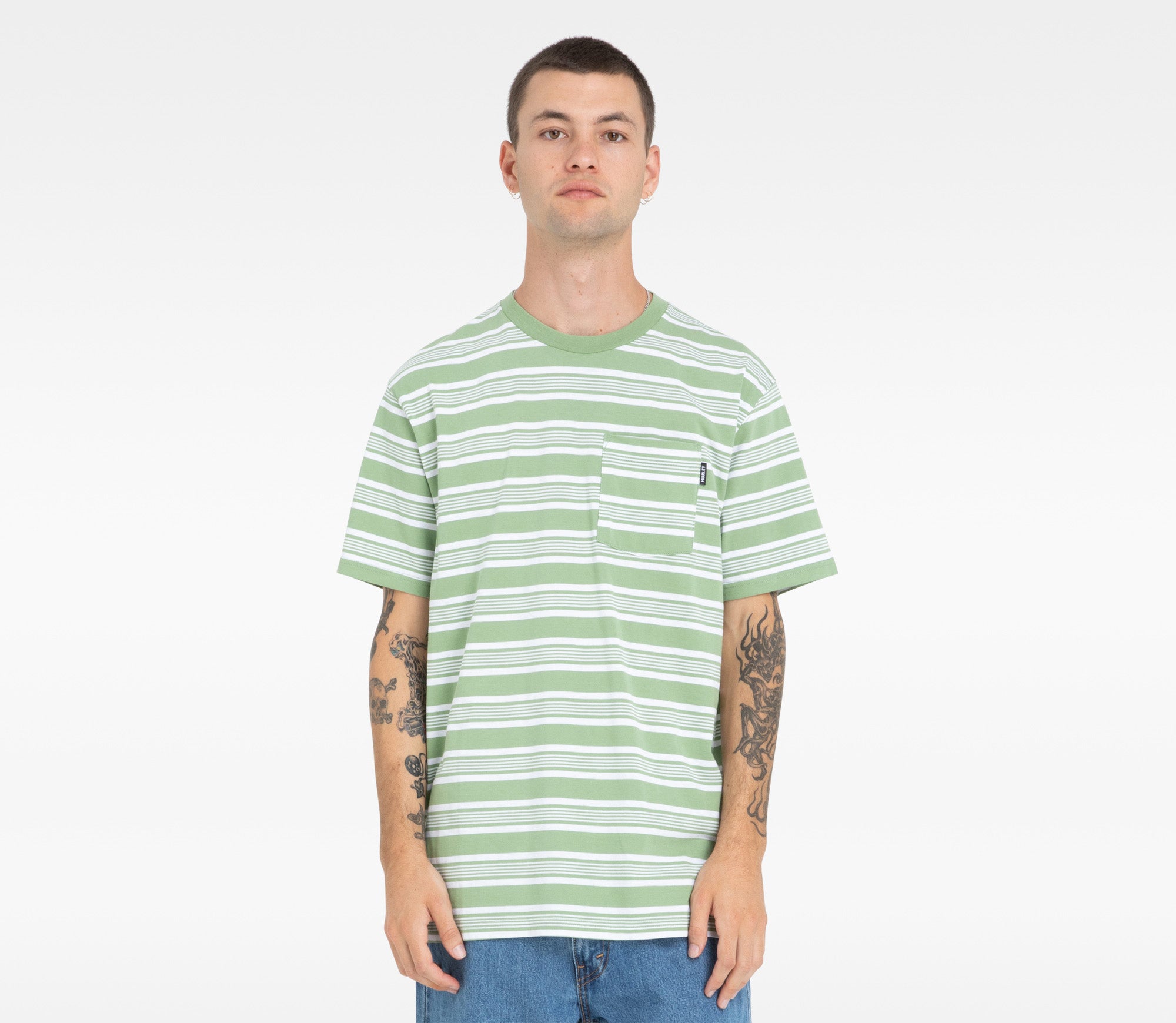 This t shirt is made with a custom yarn dye stripe, has a front patch pocket, a side pocket and a side seam label.