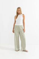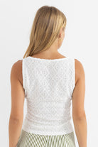 The Charm Tank in White features a high neckline crafted from semi-sheer lace fabric with decorative stitching. This elegant tank top effortlessly elevates any outfit, making it a must-have for your collection.