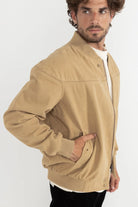 A nod to classic workwear, the Derby Jacket in Oak is lined for warmth and comfort. The ribbed collar, cuffs, and hem offer a secure fit, while the metal zip closure with a storm flap provides added protection against the elements. Finished with flap-button hand pockets, internal storage, and piping detail, this jacket is built for both utility and style.