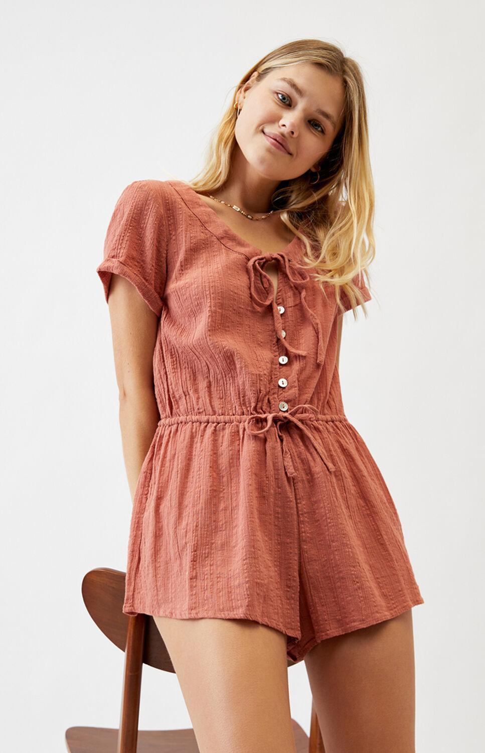 The Ella Button Front Romper in earthy toned Toffee is destined for the modern vagabond, a textured lightweight cotton in a breezy fit with elastic waist and button front closure, this summery jumpsuit is meant to be worn with the windows down and the cool breeze in your hair, driving down the dusty road on the road to somewhere.