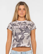 Short Sleeve Baby Tee With All Over Camo Print - Contrast Neck Binding And Front Graphic. 100% Cotton Mid weight Jersey