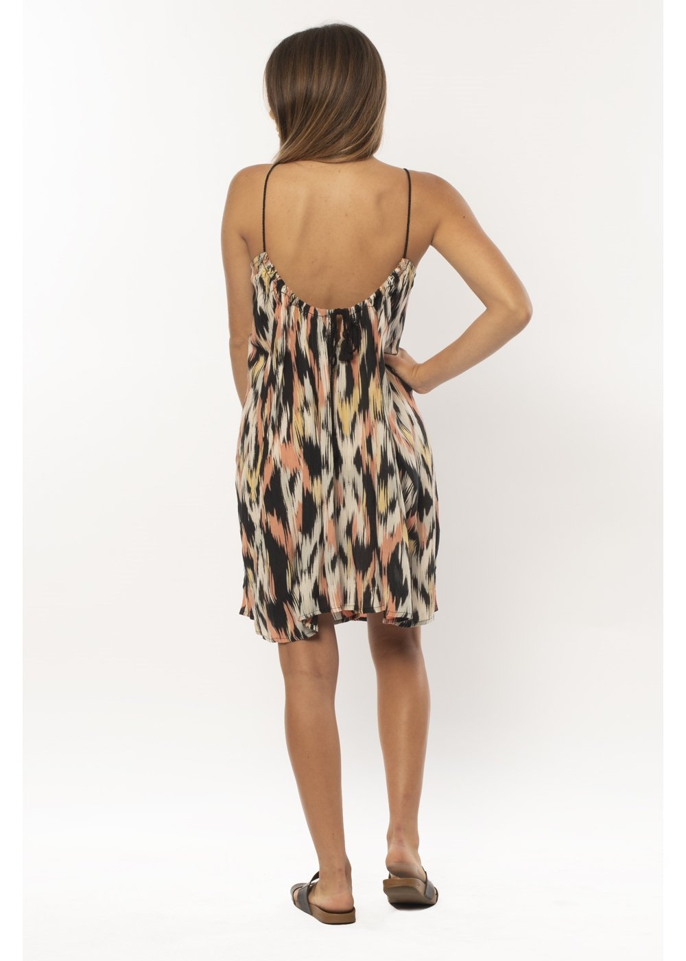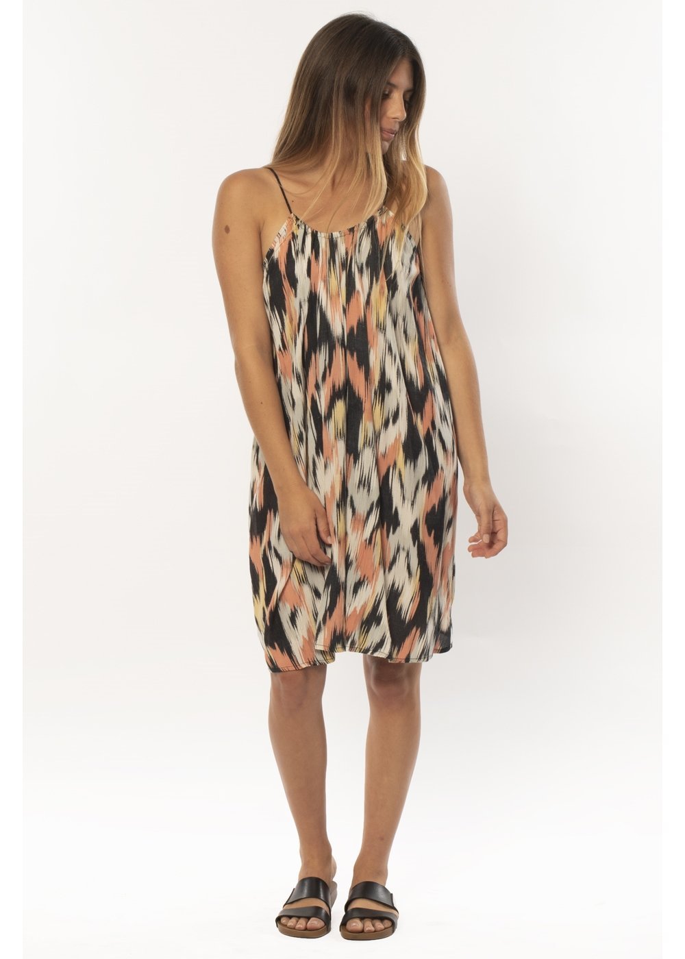 Flattering cami dress in a vivacious Eye Of The Tiger print. The Zinnia is woven in our premium eco viscose crinkle, and styled with adjustable rope cord straps tunneled through the front/back neckline, tying together at the center back. The ends of the ties are tasseled. Welcome to the jungle.