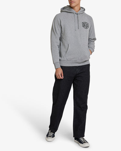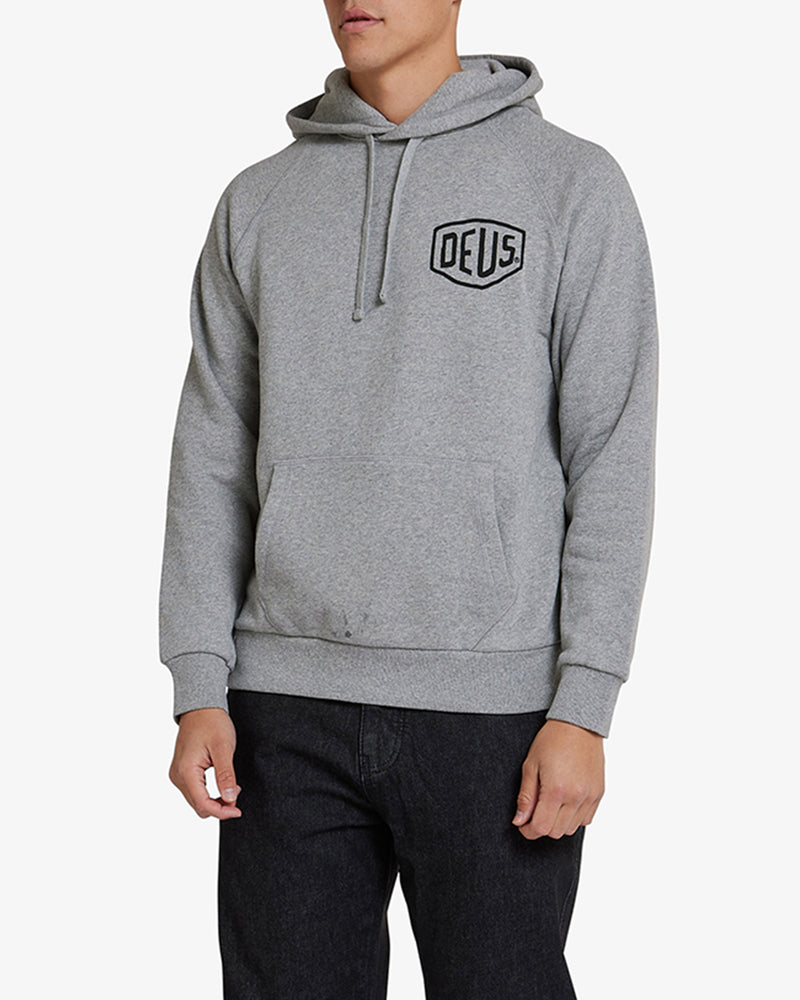A standard-fit pullover hoodie with the Deus Shield on the front and Tokyo Address print on the back, made from 32/2s + 12/1s 350gm cotton brushed-back fleece.
