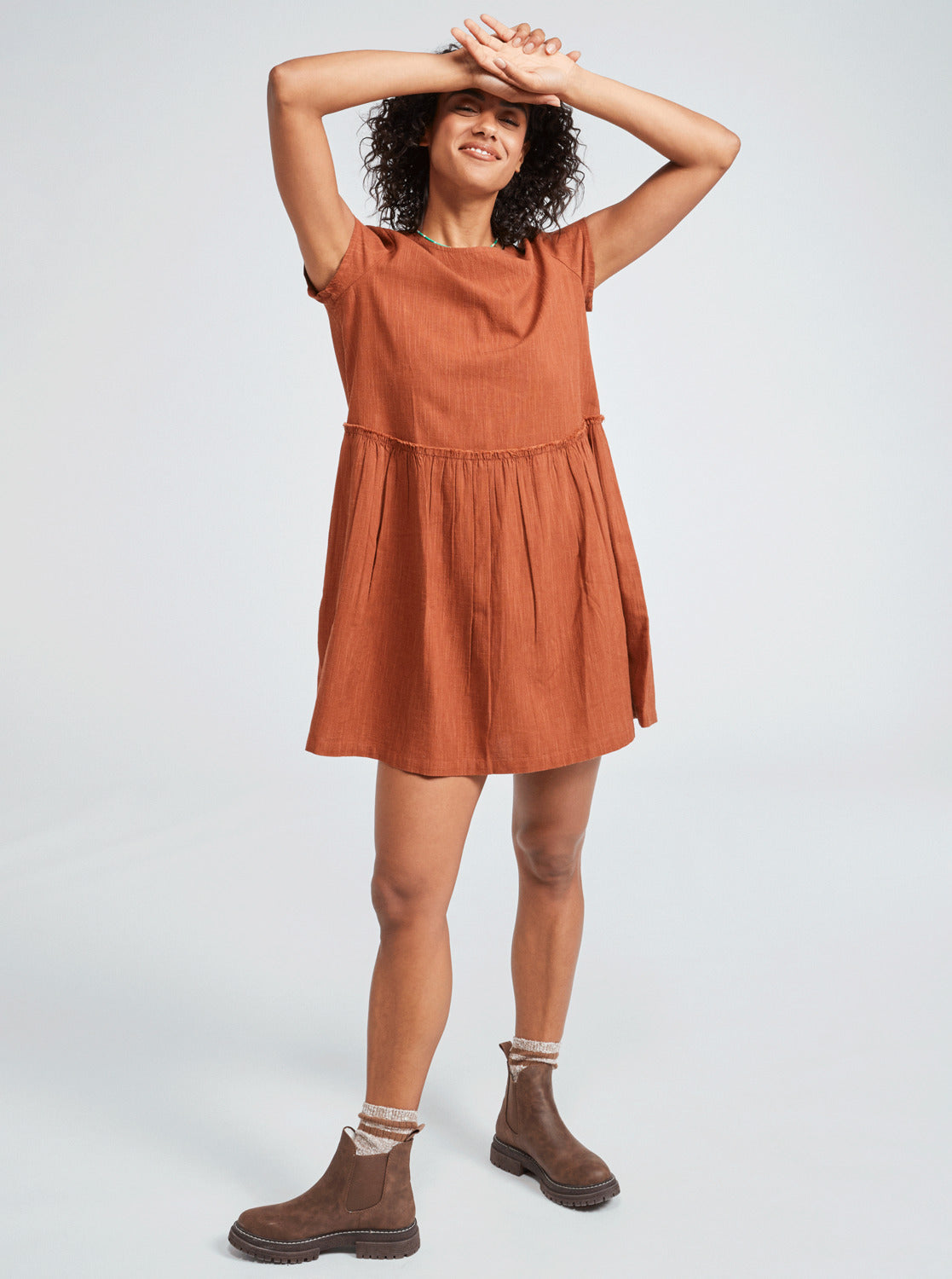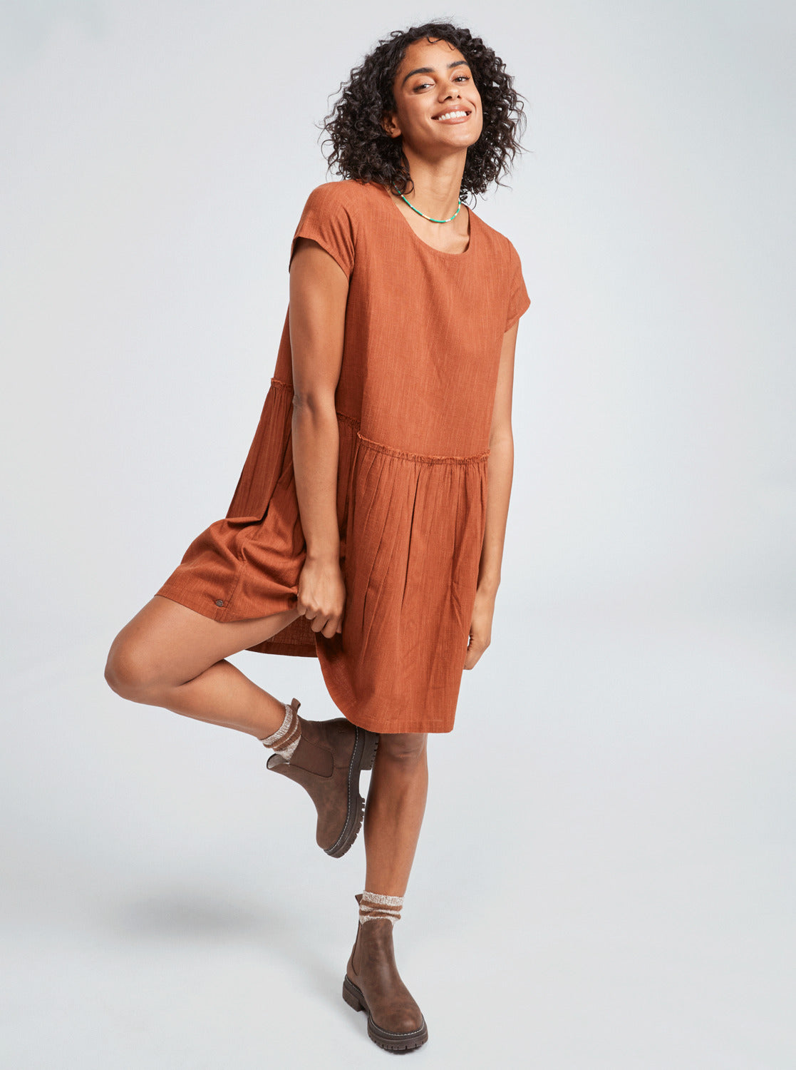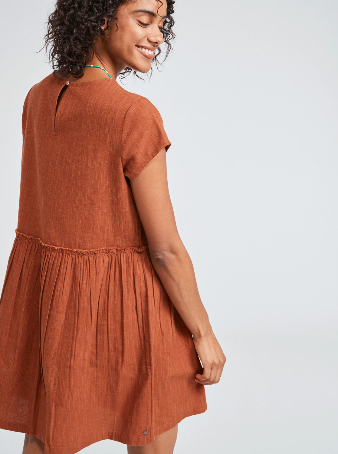Mini Dress for Women. Features include: Eco-Conscious Fabric: Cotton viscose blend fabric [150 g/m2], Fit: Loose fit, Sleeves: Cap sleeves, Neck: Scoop neckline, Other Features: Raw edge yoke on waist with gathers, Keyhole on back closed by one recovered button.