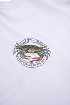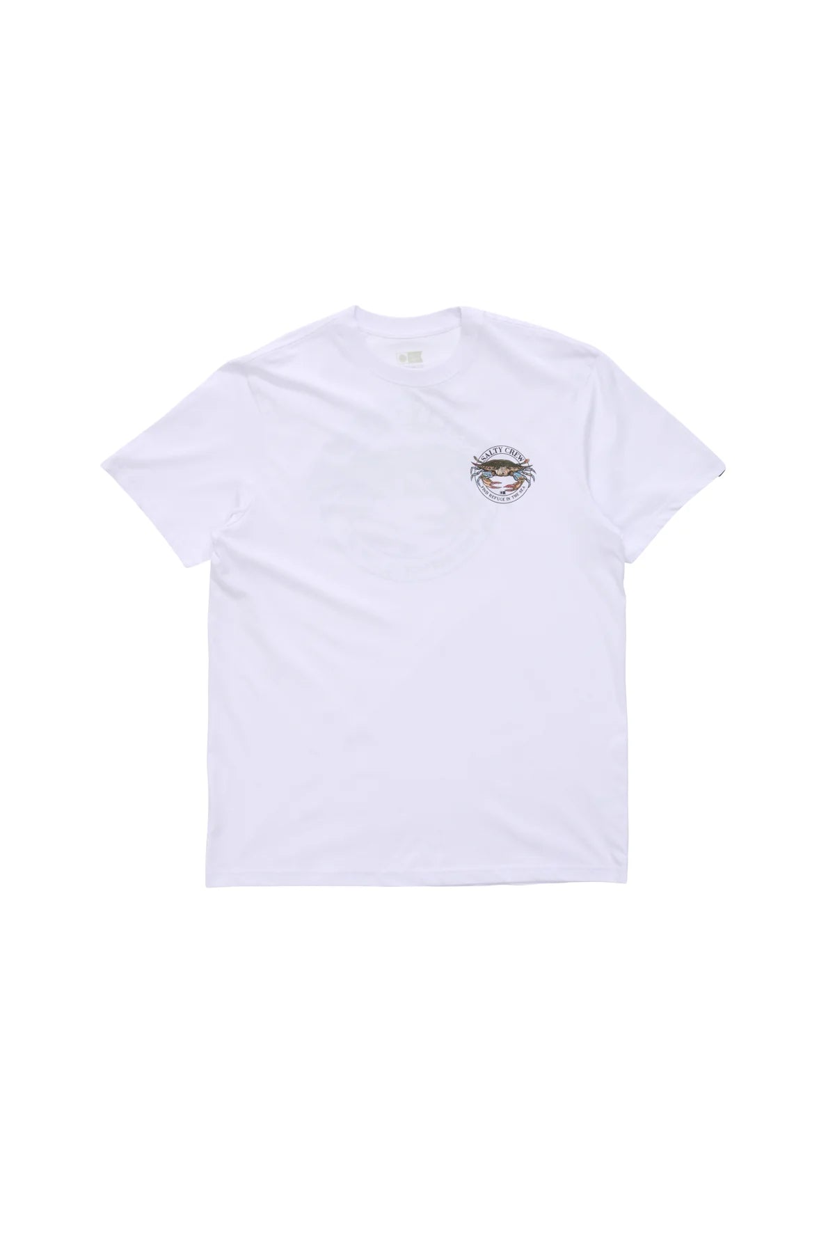 The Jimmy Premium SS Tee in White is crafted from 160gsm ring-spun cotton jersey. It includes digital prints on front and back and a Salty Crew clamp label at the sleeve hem for a refined finish.