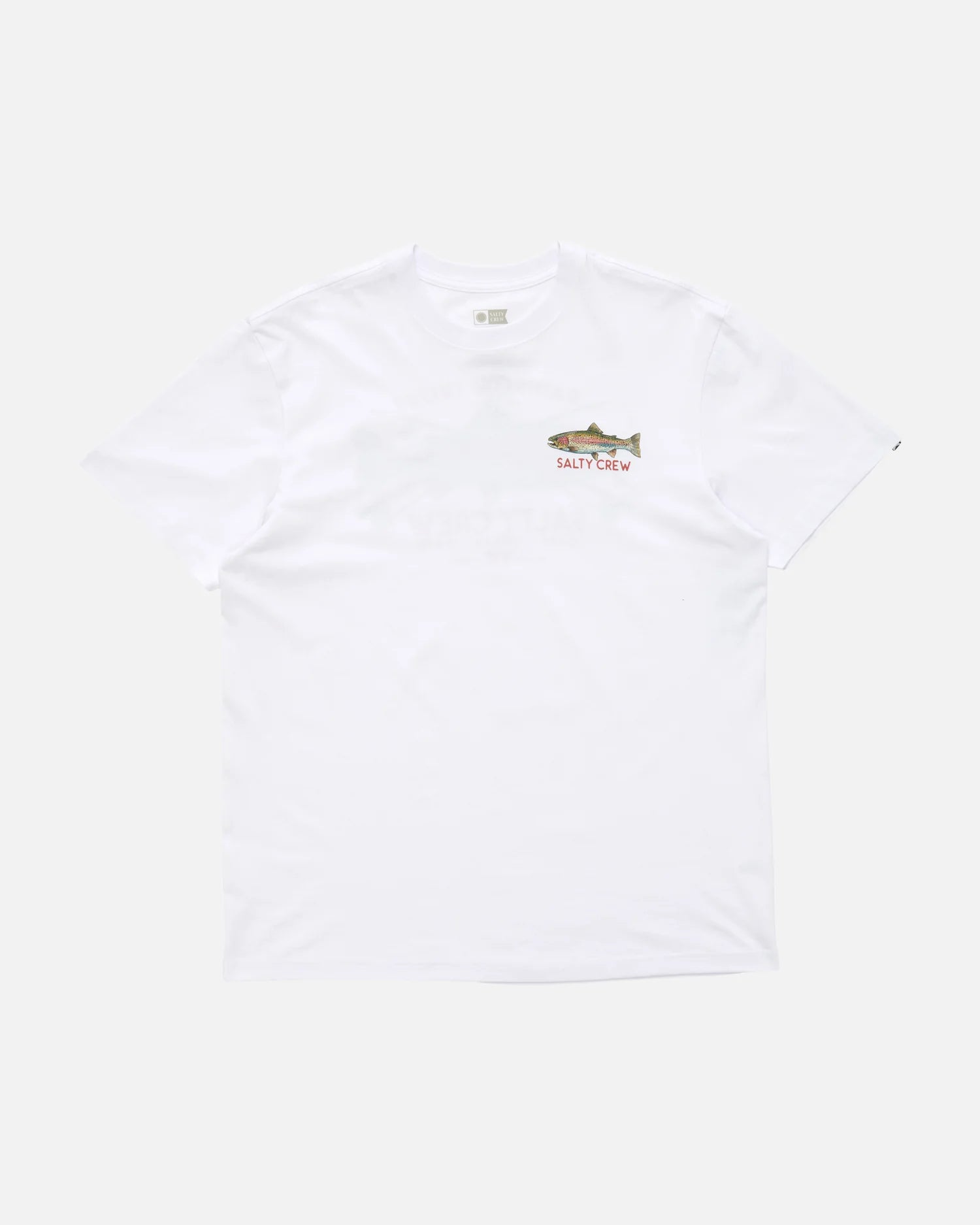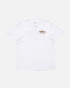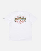 The Trout Mount Premium SS Tee in White is made from 160gsm ring-spun Cotton Jersey. It features digitally printed graphics on the front and back, with a Salty Crew clamp label at the sleeve hem.