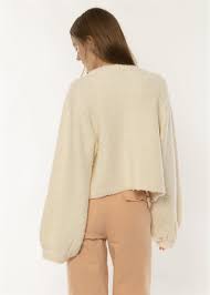 Baja Cress is a relaxed fit sweater with blouson sleeves and a button front closure. 76%Acrylic 12%Nylon 10%Wool 2%Spandex. Modeled in size Small.