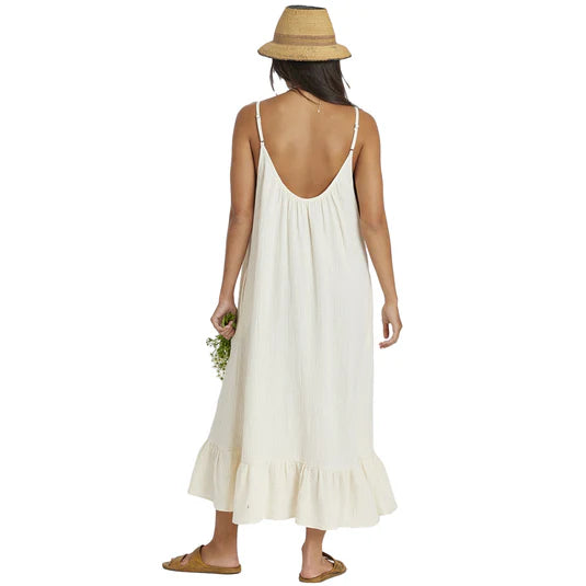 Light and breezy, this midi dress features adjustable spaghetti straps and a playful ruffle hemline. Embrace the low back moment in this sweet beach dress.