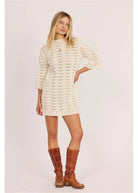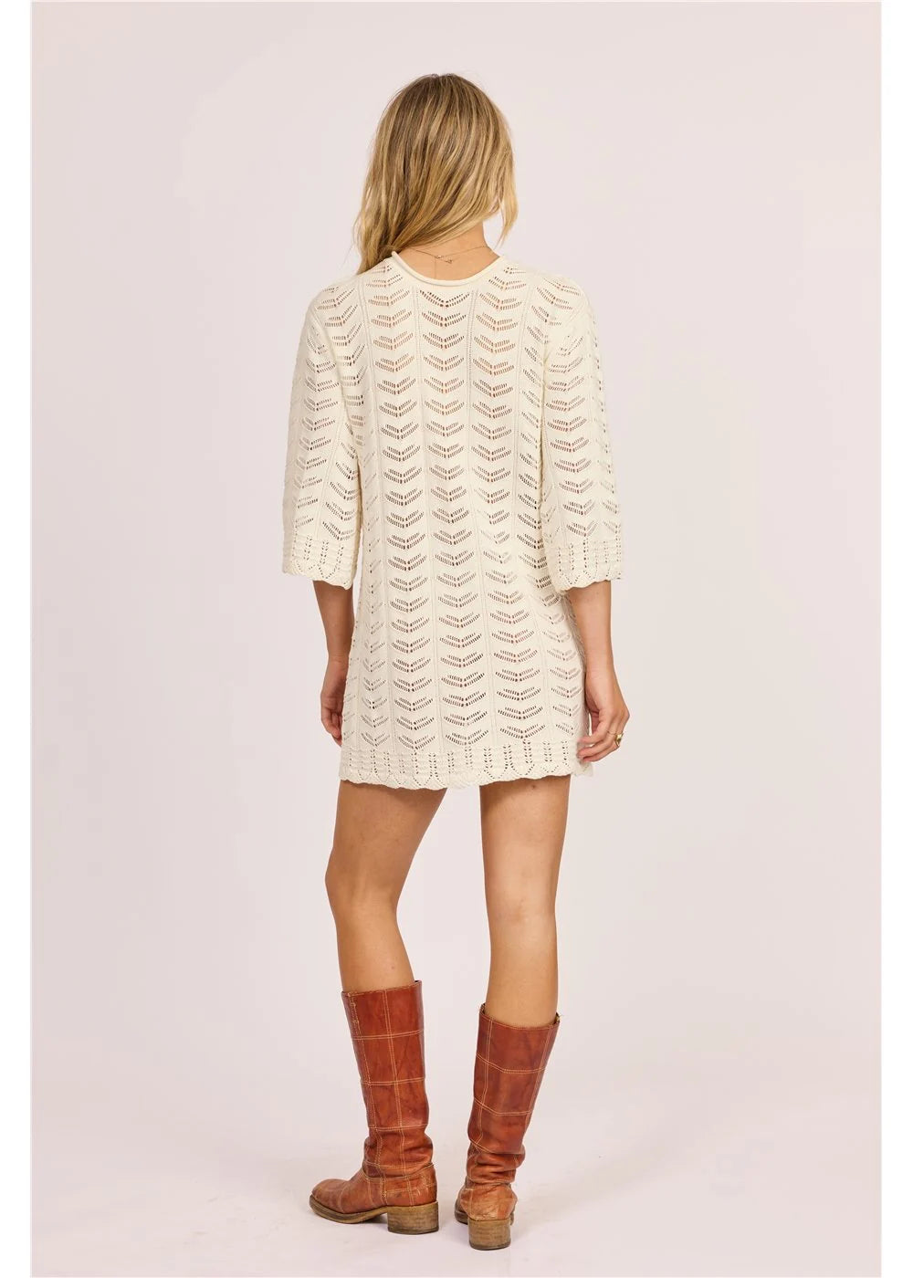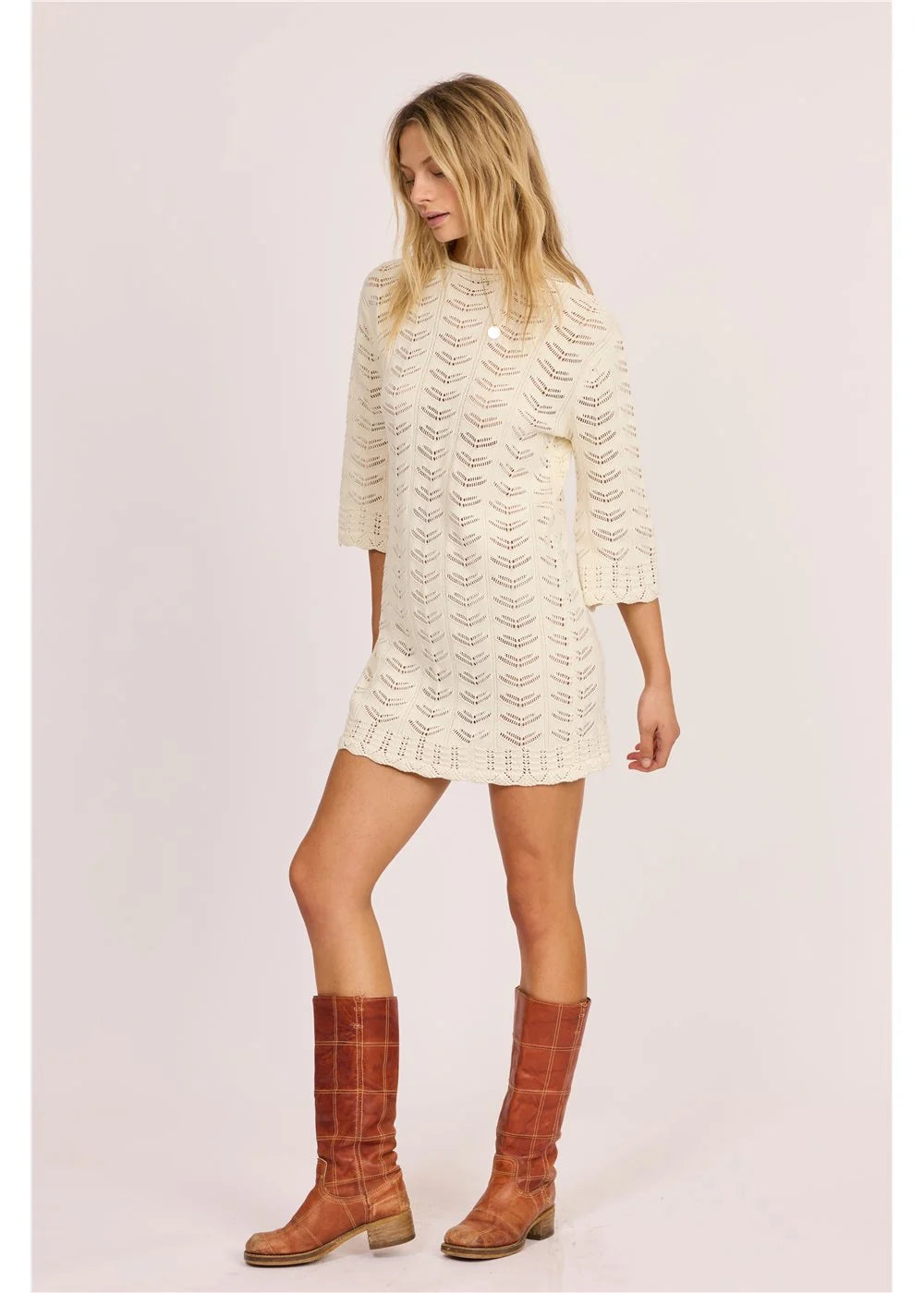 This cotton crochet dress features a relaxed fit with a subtle dropped shoulder and a cute self-neck band for a charming, effortless vibe. A true salt kiss.